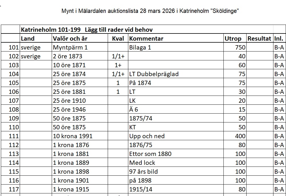 Inropade auktionsobjekt betalas med Swish alternativt till respektive klubbs Bankgiro. I övrigt gäller respektive förenings villkor för respektive auktion. Mer information kommer i kommande nummer av denna tidning. Inbjudan till dessa auktioner görs även till medlemmar i Svenska Numismatiska Föreningen samt till andra speciellt inbjudna myntklubbar. Välkommen!